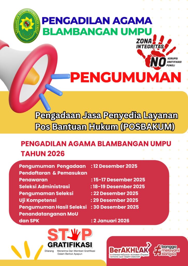 Berdasarkan DIPA TA 2026, Pengadilan Agama Blambangan Umpu membuka PENDAFTARAN calon Penyedia Jasa Layanan Pos Bantuan Hukum (Posbakum) Tahun Anggaran 2026 dengan ketentuan sebagai berikut: