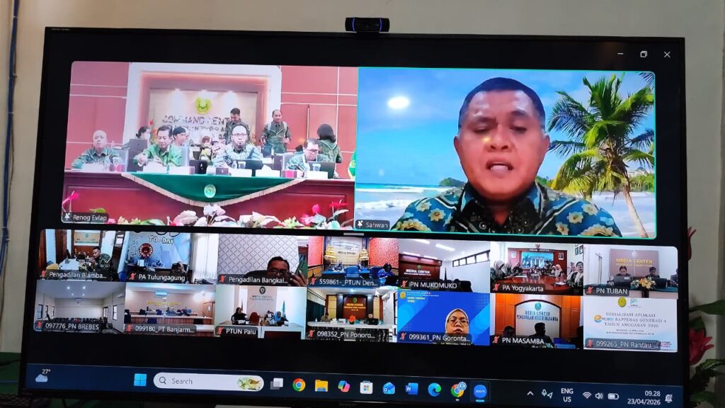 Blambangan Umpu – Sekretaris Pengadilan Agama Blambangan Umpu, Fadli Akuntanto, bersama Kasubbag PTIP, Evi Novriah, dan Operator aplikasi e-Monev Bappenas, Giarningsih, hadiri sosialisasi aplikasi e-Monev Bappenas Generasi 4, yang diselenggarakan secara daring melalui zoom, pada Kamis, (23/4), bertempat di Media Center PA Blambangan Umpu.